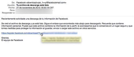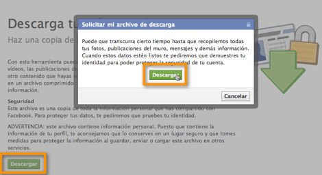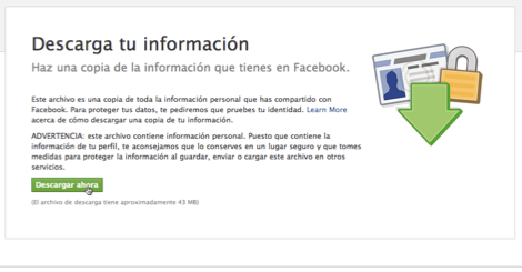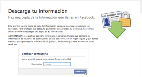 Es bien sencillo descargar todo lo que hemos subido a Facebook. Vamos a nuestra cuenta, pulsamos en “Configuración de la cuenta” y en el tab de Confuguración habrá un enlace llamado “Descargar tu información” al que entraremos. Luego de ahí, Facebook se fajará a crear un archivo .zip con todo lo que hemos subido, nuestra lista de amigos, fotos, estatus y casi todo lo demás. A la vuelta de media hora (dependiendo de cuánta paconga hayas subido) te llegará un correo electrónico con un enlace para bajar el .zip. Por seguridad, habrá que ingresar la contraseña antes de descargar el archivo.