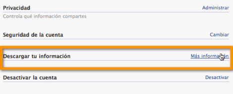Por lo visto, esta función no es reciente, pues leo que ya en octubre pasado estaba disponible. El caso es que curioseando mi cuenta en Facebook, hoy me enconttré con la opción de descargar la información que he subido a esa red social. Me parece que es una función muy poco conocida, pero de todas maneras, me extraña mucho que no me había enterado hasta ahora. Shame on me!