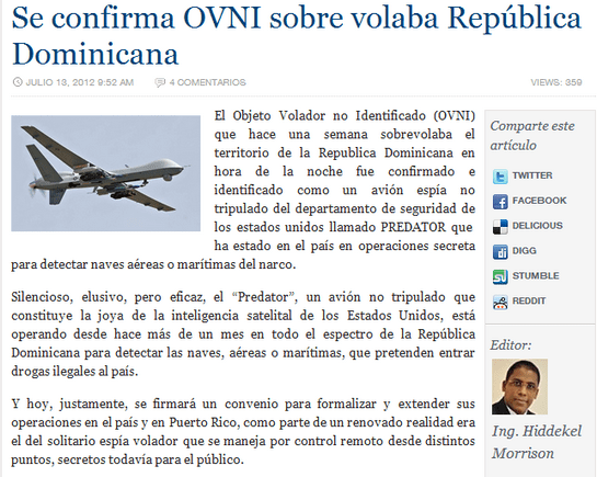Quiere esto decir que el primer párrafo de Morrison NO FIGURA en el artículo de Listín Diario, pero en ningún momento indica que es una opinión del editor o un comentario al margen. Ese párrafo inventado corrompe y desvirtúa totalmente el sentido de la noticia, haciéndola puramente sensacionalista y falsa. Pero no conformes con eso, ¡Morrison tiene el FOKIN TUPÉ de ponerlo en el titular! ¿Por qué? Para llamar la atención, para buscar que la gente, mordida de curiosidad por la rareza de que un OVNI volara en nuestros cielos, entre a leer. Justo lo que me llevó a mí a ensuciar mi mouse haciendo click en su enlace. Si esto no es una burda y asquerosa manipulación, a mí no me enseñaron bien el significado de la palabra.